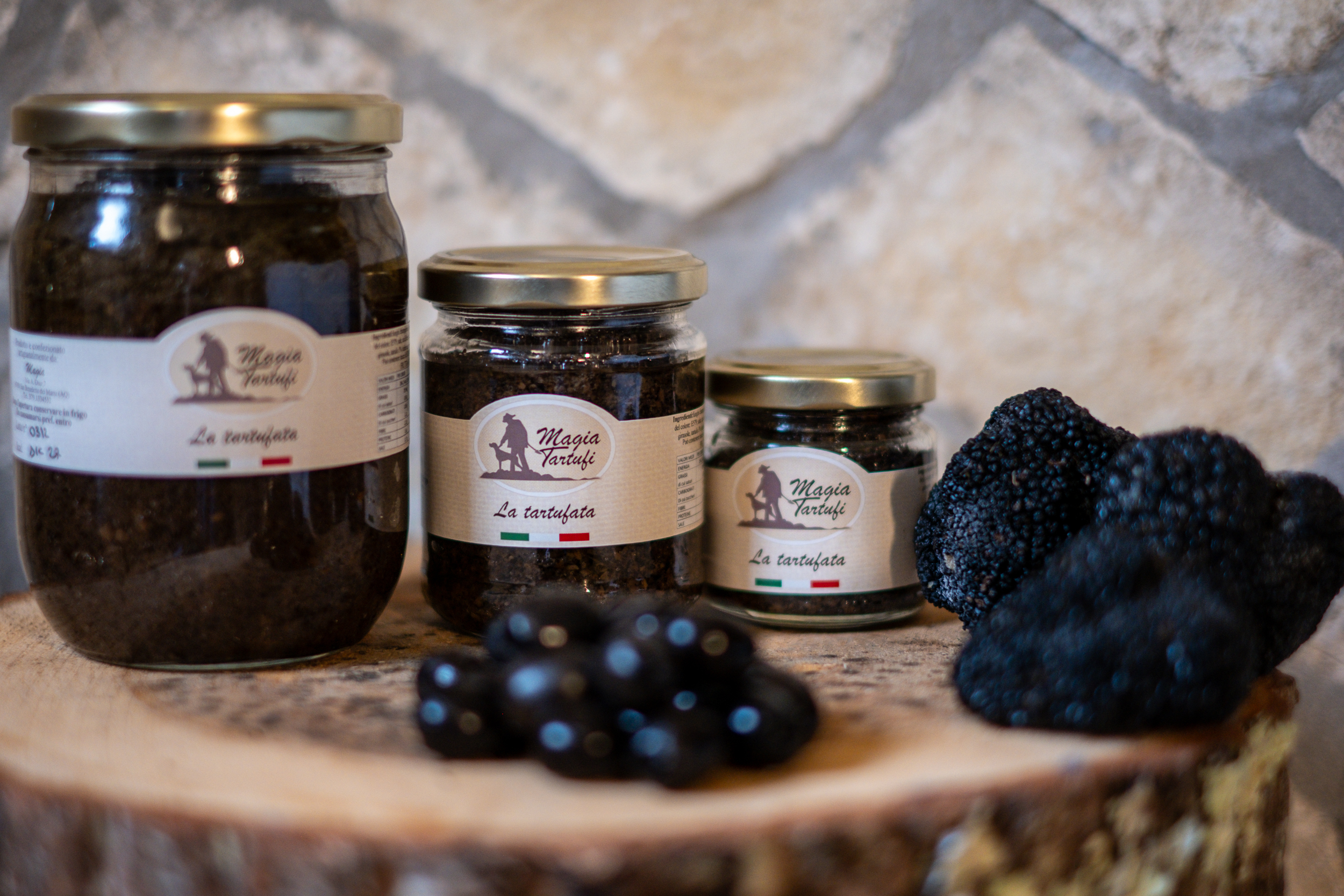 Crema sapida con olive nere, noci e tartufo, ideale per crostini e carni.